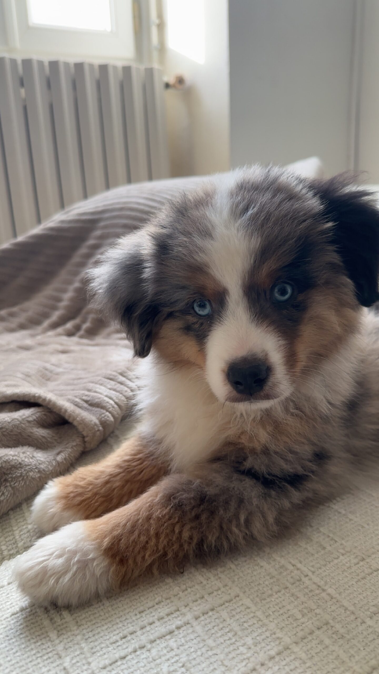 Bonsoir Joël ! J'espère que vous allez bien ? Voici quelques photos d'Uby né le 09/03/2023! Il se porte à merveille c'est un amour de petit chien Il est vraiment un petit gabarit de 5,9 kg !! Il stagne depuis 1 mois à ce poids ! La véto dit qu'il est parfait Et moi qui ne voulait pas les yeux Véron et bien loupé 😁il a un oeil particolore mais ça lui va tellement bien 🥰 bref comme vous disiez on en est vite gaga de ces petits machins là 😁 Karine B